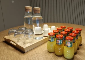 Incluye cafés, infusiones, agua, zumo, bandeja de mini bocadillos y bandeja de repostería artesana.